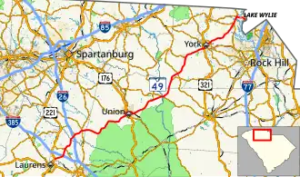 South Carolina Highway 49 (SC 49) is a 79.516-mile (127.969 km) primary state highway in the U.S. state of South Carolina. It is signed as a north–south highway, though it travels in a southwesterly–northeasterly direction, from Watts Mills to the North Carolina state line in Lake Wylie.