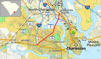 SC 7 begins at an intersection with U.S. Route 17 (US 17; Savannah Highway) in West Ashley. Here, it also has an interchange with Interstate 526 (I-526). It heads east-northeast to an intersection with SC 61. A little while later, it meets the northern terminus of SC 171. Then, the highway crosses over the Ashley River. On the east side of the river, SC 7 enters North Charleston. Almost immediately is an interchange with I-26. About one mile (1.6 km) later, it meets its northern terminus, an intersection with US 52/US 78 (Rivers Avenue).[2]