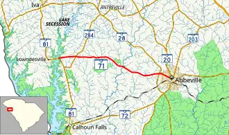South Carolina Highway 71 (SC 71) is a 14.980-mile-long (24.108 km) state highway in the northwestern part of the U.S. state of South Carolina. The highway travels in a west-to-east orientation, however it is designated and signed as a north–south highway. Its southern terminus is at SC 20 in Abbeville, and its northern terminus is at SC 81 east of Lowndesville, completely within Abbeville County.