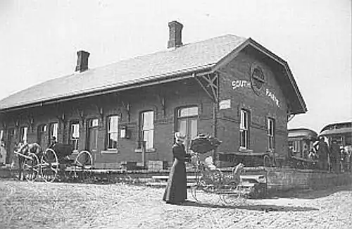 The South Paris station was a historic railroad station in South Paris, Maine. The station was built in 1883 by the Grand Trunk Railroad linking South Paris with Montreal and Portland, Maine.[1] Trains began regular operation between Portland and the depot on the Paris side of the town line with Oxford at Widow Merrill's crossing October 8, 1849, even though the station was listed as "North Oxford" in timetables. The first train into South Paris village was a contractor's engine called the Jenny Lind on January 1, 1850. It ran carefully across temporary bridgework up to where the station was being built, as a means of satisfying the investors worries from Paris Hill to counter their threat of withdrawing their support and money if there was not a train in the village proper on that date (an engine operating by itself without cars met the ruling of a train). The Androscoggin bridge was completed March 15, 1850, with regular service to Portland from the present day station grounds to Portland beginning on the 18th. On December 30, 1879, the Norway Branch Railroad opened, running from Norway village on a line 1.45 miles long to connect with the Grand Trunk Railroad at South Paris.[2]