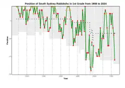 In 1988, the club began to play in the Sydney Football Stadium,[55] just built upon the former Sydney Sports Ground and Sydney Cricket Ground No. 2 Oval. The side continued to play here up until 2005, with the exception of 2000 and 2001 when South Sydney was absent from the premiership. During 2004–2005, when the Rabbitoh's contract with Sydney Football Stadium was about to expire, new home grounds were investigated at Gosford, North Sydney Oval and Stadium Australia. Eventually the decision was made to relocate to Stadium Australia at Sydney Olympic Park. The move was generally not well received by the fans,[56][57] but provided considerably more income for the club, which was several million dollars in the red at the end of 2005.[58] In 2008, the club renewed its partnership with Stadium Australia to play NRL home games and home finals at the venue for the next 10 years.