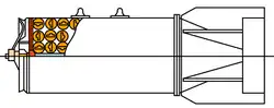 obturator type - have in their design a rigidly fixed obturator disk, which, after the remote fuse is triggered and the expelling charge is ignited by it under the action of powder gases, is separated from the glass and moves inside the bomb body along with the central pipe around which small aerial bombs are placed. The tail cone is separated, and the combat elements extend beyond the cassette.