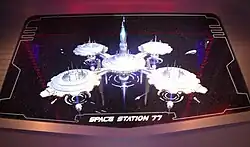 In 2015, the ride was given a Star Wars overlay titled Hyperspace Mountain, which has come and gone over the years.[8] Among the changes are that the ride vehicles are now referred to as "reconnaissance vessels", the setting being the planet Jakku from Star Wars: The Force Awakens, and the pre-flight safety video featuring a briefing from Admiral Ackbar.[9]