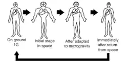 Microgravity is the condition of low gravity found in outer space. Some of the major physiological implications that are associated with microgravity are bone loss, immunosuppression, enlargement of bones, muscle loss and movement of body fluids towards the head, spaceflight osteopenia, decrease in the function of cardiovascular system functions, decreased production of red blood cells, balance disorders, and also weaken the human immune system.[3] In addition to this, fluid distribution is increased in the upper body due to the body's ability to pump blood faster to the upper body in microgravity conditions, known as the cephalad fluid shift.[3][5] In addition, muscle regeneration protein levels have been estimated to vary due to microgravity conditions, including myostatin, activin A, and certain cytokines (e.g. IL-6, IL-10, IL-1ra), which are currently used as targets for drug delivery applications.[3] The effects of microgravity has also investigated in wound healing processes, especially with the behavior of cell populations, such as fibroblasts.[7] For cell studies, a Rotary Cell Culture System was used to mimic cell conditions in microgravity, where the bioreactor rotates horizontally, causing cell sedimentation in the vessel to be offset by the rotating fluid.[7] This results in this light falling of cells, simulated in a microgravity environment. Studies showed a rearrangement of microtubules in cells due to microgravity, forming a dense, puzzled, network, unlike fibroblasts in a normal environment, which exhibit radial parallel formations.[7] Several proteins in the wound repair process that are expressed by fibroblast activation, such as SMA, VEGF, and E-CAD proteins, were repressed or significantly decreased.[7] However, pro-inflammatory signals, such as COX-2, were shown to increase by 87%.[7] Another physiological factor affected by microgravity are membrane pores in cells. It was studied that under hypergravity, porins are increased while they are decreased in microgravity environments, which can impact drug metabolism and intake.[8] Drug studies have shown potential advantages with microgravity conditions, such as less particle sedimentation or coalescence, however, microgravity conditions prevent the removal of air bubbles in injectable drug formulations, posing challenges for liquid drug infusions.[5] In addition, best-rest models are used on Earth to study the pharmacodynamics of drugs in microgravity conditions.[5]