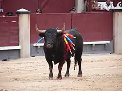 The bull then enters the ring to be tested for aggressiveness by the matador and banderilleros with the magenta and gold capote (dress cape).[23] Bulls are raised on the open range by specialist breeding estates called ganadería. The bull enters the arena with a rosette on its back bearing the colours of the estate of its origin.[24]