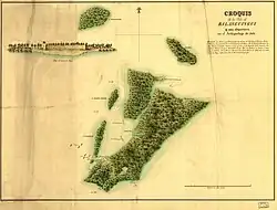 Balanguingui was a small island with an area of 6 square miles, covered with mangroves and jungle.[5] The ground was so flat and swampy that when the tide rose, just a few sandbanks remained dry.[5] Four forts stood over these sandbanks, surrounded by some houses built on stilts.[5] A shallow channel divided the island in two portions, also spreading into several branches which penetrated inside the ground, making Balanguingui a swampy maze.[5] The forts were known by the names of Sipac, Balanguingui, Sungap and Bocutingol.[5] The first two were the biggest, and were located at the tip of the largest estuary.[6] Their walls were built with tree trunks ranging from 2 to 3 feet in diameter and from 18 to 20 in height, and were reinforced by fences and stone embankments.[6]