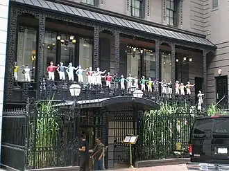 Speakeasies did not need to be big to operate. "It didn't take much more than a bottle and two chairs to make a speakeasy."[30] One example for a speakeasy location was the "21" Club in New York. This is one of the more famous of the speakeasies and operated until 2020. The "21" Club was only part of a series of businesses owned by Charlie Berns and Jack Kriendler. They started the business in Greenwich with a place called "The Redhead" and later moved onto the next operation "The Puncheon Club". The "21" Club was special because of its system to remain under the radar. It was a unique system that used a doorkeeper to send a warning to the bar that it was in danger and the bar would transform into an ordinary place through a mechanism.[31]