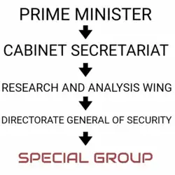 The Special Group functions under the Directorate General of Security (DG Security) of Research and Analysis Wing (RAW), which is India's foreign intelligence agency.[5][18] The unit serves under the command of the prime minister through the Cabinet Secretariat.[2][6] Within RAW, the Secretary (Research) is responsible for the Special Group.[19]