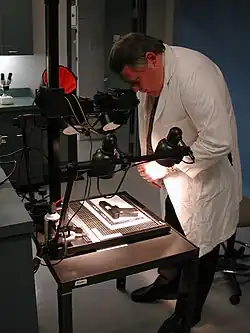 Currently, the SIU is equipped with their own in-house forensic identification team, staffed entirely by civilians. They are now well equipped with tools and personnel.[18] The in-house forensic identification team is an important part of most investigations. It is managed by two supervisors and staffed by a handful of forensic identification technicians and includes a fully equipped laboratory.[18] The forensics identification team is responsible for protecting, collecting, preserving, and analyzing the physical evidence. Their duties include the interpretation of trace evidence and recording of the autopsy process. The team has particular expertise in several areas of forensics, including collision reconstructions, scene mapping, and bloodstain pattern analysis. They also liaise with scientists at the Centre of Forensic Sciences in Ontario and other external experts for DNA analysis and ballistics.