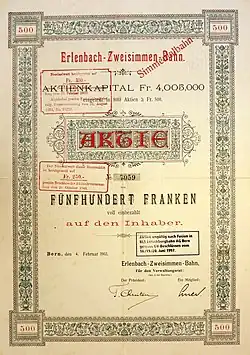 The SEZ was formed on 1 January 1942 from the merger of the Spiez-Erlenbach-Bahn (SEB), which opened the line from Spiez to Erlenbach on 16 August 1897, and the Erlenbach-Zweisimmen-Bahn (EZB), which opened the line from Erlenbach to Zweisimmen on 31 October 1902.