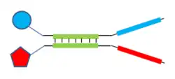Self-assembling library. Circle and pentagon are BBs, blue and red rectangles are their codes. Green rectangles are hybridizing domains