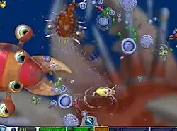 The Cell Stage (sometimes referred to as the tide pool, cellular, or microbial stage) is the very first stage in the game, and begins with a cinematic explanation of how the player's cell got onto the planet through the scientific concept of panspermia, with a meteor crashing into the ocean of a planet and breaking apart, revealing a single-celled organism. The player guides this simple microbe around in a 3D environment on a single 2D plane, reminiscent of Flow, where it must deal with fluid dynamics and predators, while eating meat chunks or plants. The player may choose whether the creature is a herbivore or a carnivore prior to starting the stage.[9] The player can find "meteor bits" (apparently from the aforementioned panspermic meteor) or kill other cells to find parts that upgrade their creature by adding abilities such as electricity, poison or other parts. Once the microbe has found a part, the player can call a mate to enter the editor, in which they can modify the shape, abilities and appearance of the microbe by spending "DNA points" earned by eating meat chunks or plants in the stage.