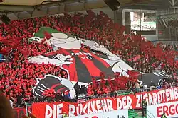 The new Südkurve (or south end) was also built after the promotion in 2012 in place of the old Südtribüne. In the process, the new stand was completely covered and provided with its own floodlights, since the roof restricts the light field of the floodlights. In front of blocks, A and B is a raised and covered platform with a ramp for wheelchair users. The only built-up curve in the stadium is occupied by the "Der Lohner" standing stand, which is named after the late former club president Edgar Burkart, known as Lohner. Behind the goal, there is a seating grandstand, which is built somewhat lower in the area of the scoreboard. Adjacent to this is the guest block, whose standing-room area has been carried over without change from the times before promotion. In total, the south stand can accommodate around 8,300 people.