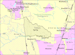 Spring is a census-designated place (CDP) within the extraterritorial jurisdiction of Houston in Harris County, Texas, United States, part of the Houston–The Woodlands–Sugar Land metropolitan area.[4] The population was 62,559 at the 2020 census.[2] While the name "Spring" is popularly applied to a large area of northern Harris County and a smaller area of southern Montgomery County, the original town of Spring, now known as Old Town Spring, is at the intersection of Spring-Cypress and Hardy roads and encompasses perhaps 1 square kilometer (0.39 sq mi).