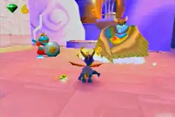 Year of the Dragon is a platform video game primarily played from a third person perspective.[2] The main objective is to recover stolen dragon eggs which are scattered across 37 levels.[3] These eggs are hidden, or are given as rewards for completing certain tasks and levels. The worlds of Spyro are linked together by "homeworlds" or "hubs", large worlds which contain gateways to many other levels. To proceed to the next hub, the character must complete five worlds, gather a certain number of eggs, and defeat a boss.[4]: 1–8 Players do not need to gather every egg to complete the main portion of the game or gain access to new levels; in fact, certain eggs can only be found by returning to the world at a later time. Gems are scattered across the worlds, hidden in crates and jars. These gems are used to bribe a bear named Moneybags to release captured characters and activate things which help Spyro progress through levels. Gems, along with the number of eggs collected, count to the total completion percentage of the game.[4]: 8 An atlas allows players to track their game completion and see remaining unfilled objectives.[5]