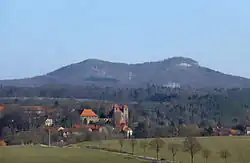 The monastery church is situated at an altitude of approximately 210 meters above sea level on the Kirchberg. It is located about 30 meters north of a cliff edge that drops steeply down to the valley of the Wendebach stream and the village center of Reinhausen, which is situated in the valley to the southeast of the church.[1] The church's location on a spur of the Knüll, which extends to the west and rises steeply above the village, makes it highly exposed.[2] In contrast to the village center, the location is visible from the adjacent hills to the west and even from the western slope of the Leinetal valley.