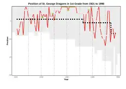 While shaded by the spectacular success of the previous decade, the Dragons remained competitive throughout most of the 1970s winning premierships in 1977 and 1979, being runner-up Grand Finalists in 1971 and 1975 and finishing the regular season in 3rd place or better in all years excepting 1974 and 1978.[13] In the late 60s and into the early 70s St George got their best value out of Billy Smith and Graeme Langlands after all the other stars of the long reign had gone. It was largely due to their combined class and the apparent on-field intuitive understanding of each other's kicking and positional game that the club showed consistency of form through to the mid-1970s.[14]