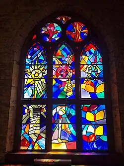 The inside of the present church is decorated with modern stained glass which can be seen behind the altar, at the back of the church, and adorning the doors.