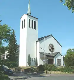 After World War II around 180 people gathered for services, first in the villa of the entrepreneur and politician Florian Klöckner. In 1948 a property was found on which to build a church. The architect was Alfred Kalmbacher, whose second design was approved in June 1951. The building was managed by St. Clemens.[1] The new church was consecrated on 26 September 1954 by Franz Hengsbach. [1]: 6 An organ was built in 1956 by Anton Feith.