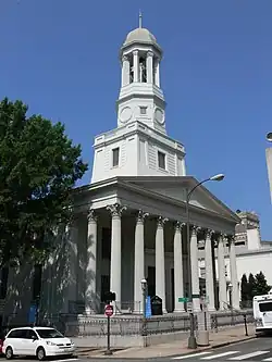 St. Paul's was built in 1845 as a branch of the Monumental Church, which had outgrown its building. The Greek Revival church was designed by Thomas Somerville Stewart and modeled largely on St. Luke's Church, now Church of St. Luke & the Epiphany, in Philadelphia.[4] The cornerstone was laid on October 10, 1843 and the church was consecrated on November 11, 1845.[5] The estimated cost before construction was "not exceeding $53,500," excluding the organ and purchased lots. This cost later rose to $55,000. The organ was purchased for around $4,000 and the two lots for the church were $6,000 and $1,075. In 1845, there were 804 sittings in the nave and 358 in the gallery for a total occupancy of 1,162 parishioners.
