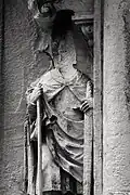 Two portals provide access to the building, one from the west and one from the south. The tympanum of the west portal portrays a knight, armed with sword and shield, battling a dragon. The head of a man, whom the dragon has swallowed, is visible between its jaws. The representation may allude to the words of Psalm 35/34: