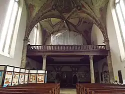 The choir with wooden balustrade stands on Tuscan stone pillars with capitals. There is a painted wooden ceiling under the choir. The western wall under the choir is painted with 4 Latin inscriptions, which were added in the reconstruction from 19th century. There is a columbarium under the choir.