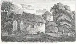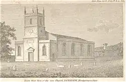 The earliest mention of the church is in the Norwich Taxation of 1254 and by the Lincoln Taxation of 1291 it the church was held by the Cistercian Abbey of Strata Marcella near Welshpool.[4] Fortunately two illustrations exist of the earlier church at Berriew, which was demolished in 1802. The first watercolour of 1796 was commissioned by Thomas Pennant from the artist John Ingleby. Pennant was intending to re-publish his Tours in Wales and to use this as an illustration. In his original tour in July 1776, he had visited Vaynor Park in Berriew, although he does not mention the church. John Ingleby shows the church from the South East with a typical Montgomeryshire bellcote. He also shows the chapel on the North East side of the Church, which, at that time housed a monument to Arthur Pryce of Vaynor Park, who died in 1597. The second depiction of the Church is a print of 1798 by the Rev William Parslow. It was published in the Gentleman's Magazine in 1800. It shows the church from the North West, with the chancel chapel in the foreground and the bellcote with a clock. A lych gate can be seen on the right in the same position as the present lych gate. The church is raised up on a slight mound.