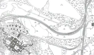 From the platform at Leek Brook, the tramway swung to the right alongside the exchange sidings from the NSR. Railway engines were not allowed further than these sidings under the various agreements between the NSR (and its successor the London, Midland and Scottish Railway[7] and also because being lightly built the tramway could not take the weight of railway locomotives.[5] Past the sidings the line climbed steeply with a maximum gradient of 1:16.6 (6%) being encountered.[4] The line then proceeded by way of a switchback arrangement to terminate at the rear of the main hospital building.