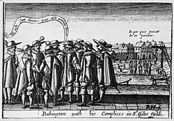In 1414, St Giles Fields served as the centre of Sir John Oldcastle's abortive proto-Protestant Lollard uprising directed against the Catholic Church and the English king Henry V. In anticipation of Protestantism, Lollard beliefs were outlined in the 1395 The Twelve Conclusions of the Lollards which dealt with, among other things, their opposition to capital punishment, rejection of religious celibacy and belief that members of the clergy should be held accountable to civil laws. Rebel Lollards answered a summons to assemble among the 'dark thickets'[13] by St. Giles's Fields on the night of Jan. 9, 1414. The King, however, was forewarned by his agents and the small group of Lollards in assembly were captured or dispersed. The rebellion brought severe reprisals and marked the end of the Lollards' overt political influence after many of the captured rebels were brutally executed. Of their number, 38 were dragged on hurdles through the streets from Newgate to St Giles on January 12 and hanged side by side in batches of four while the bodies of the seven who had been formally condemned as heretics by the Catholic Church were burned afterwards. Four more were hanged a week later. Finally, on 14 December 1417 Sir John Oldcastle himself was hanged in chains and burnt 'gallows and all' in St Giles Fields.[14]