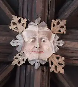 Over the nave and chancel is a continuous camber-beam and panel oak ceiling with diagonal cross-braces, large carved bosses at the junctions of the main beams and smaller ones at the junctions of the secondary beams.[2] There are no memorials of distinction and most of the old fittings were discarded in the 19th-century restorations. A 17th-century altar table is still present.[6] The three-manual organ was built between 1870 and 1880 by Young and Son and later rebuilt by Charles A. Smethurst.[22] The clock is a double three legged gravity feed made by engineers W. H. Bailey of Salford.[23] Taking the place of a still earlier clock mentioned in the churchwardens' accounts[24] it was installed in 1888[25] and refurbished in 1911.[26] There is a ring of eight bells cast by John Taylor and Company of Loughborough in 1911.[27] The earliest mention of bells in the churchwardens' accounts is in 1692. Until 1877 there were six bells, two more being cast by Taylor's and added that year. All eight bells were taken down, recast and rehung in 1910, again by Taylor's.[26] Inscriptions on the bells before they were recast showed five had been cast in 1712 and one in 1852: the inscription on the No. 5 bell at the time of the 1910 recasting read "Richard Sanders of Bromsgrove[28] made us all six".[29] The parish registers begin in 1561 and the churchwarden's accounts date from the 17th century.[6]