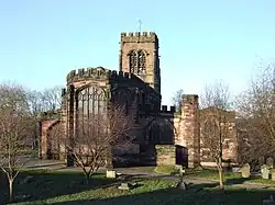 In the churchyard is a red sandstone sundial with a copper dial which is listed Grade II.[30] It was erected in 1800 by the stonemason John Moors at a cost of £10.3s.3d.[31] The churchyard also contains the war graves of seven soldiers of World War I, and a Royal Navy sailor of World War II.[32] An upper portion of a floriate medieval gravestone removed during 19th-century renovations lies near the south porch.