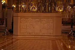 The altar was inspired by early-Irish crosses and has imagery of Christ (Crucified, Risen, Return in Glory), flanked by Apostles, on three sides. The fourth side visible from the main body of the Church shows Our Lord with four Irish saints: St. Patrick, St. Malachy, St. Brigid and St. Oliver Plunkett. Two pairs of brass gates which had survived from the 1899 marble Rood Screen were replicated several times over, welded together, topped with newly-designed Gothic cresting and made into a new fully brass screen behind the high altar, restoring a separate Lady Chapel area as the culmination of an ambulatory around the sanctuary area. The tabernacle was removed to the South transept which was itself screened off with further brass screens and the Cathedra placed on a dais directly behind the new altar. An Evangelarium was created in the South tower (now converted to a shop) and the baptistry was restored at the base of the North tower. The base of McCarthy's reredos was restored and the 1904 inlaid marbles uncovered. By the time of the rededication of the cathedral on 25 May 2003, more than £6,000,000 had been spent.