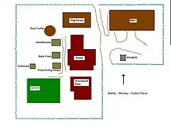 The Kuhns farm includes the farmhouse, a bank barn, a windmill, a "grossdaadi haus," (grandfather house), an outhouse, a food drying house, a bake oven, a smokehouse, a root cellar, a hoghouse, and a garden plot.[2] Associated with the farmstead is a cider mill, which was operated by the Kuhns family. The mill building was moved onto the property by the family around 1900. The mill is not a part of the historic area because it was moved onto the property.[2] The garden plot is a site. The windmill and root cellar are structures, which were supportive of human activities. The windmill was used to generate power; the root cellar was related to food storage.[2]