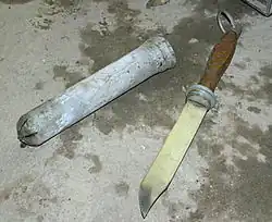 The diver's knife is a tool which is primarily intended for cutting away entanglement with ropes, lines and nets. It can also be used to some extent to pry and hammer, as well as cut, and may have a metal pommel for hammering, but the professional diver generally carries tools better suited to the work, and will use a hammer or pry-bar when that work is planned. The knife often has one side of the blade serrated to cut heavy material such as thick rope, and a sharper plain edge for cutting fine lines such as monofilament fishing line and nets. There are two common styles of traditional diver's knife sheaths; one is flat with a spring retention and the other has a circular section with an acme triple-start thread, allowing the diver to insert the knife in any orientation, rotate to engage the threads and lock the knife into the sheath.[16][17]