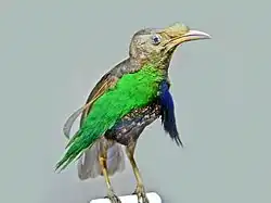 The standardwing bird-of-paradise is medium-sized, approximately 28 cm long, and olive brown. The male has a gloss violet-and-lilac coloured crown and emerald-green breast shield. Its most striking features are two pairs of long white plumes coming out from the bend of the wing that can be raised or lowered at the bird's will. The unadorned olive-brown female is smaller but has a longer tail than the male.