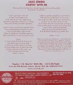 "Startin' with Me" is a song co-written and recorded by American country music artist Jake Owen. It was released in October 2006 as the second single and title track from his debut album of the same name. The song became Owen's first Top 10 hit on the US Billboard Hot Country Songs chart at number 6.