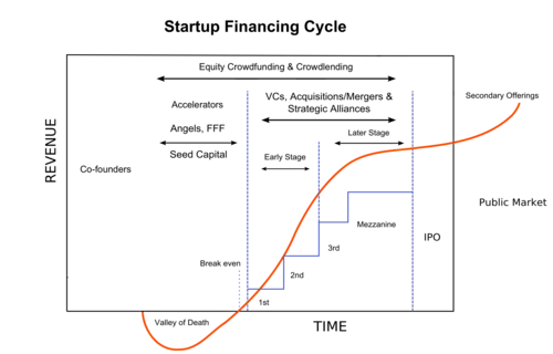 When investing in a startup, there are different types of stages in which the investor can participate. The first round is called seed round. The seed round generally is when the startup is still in the very early phase of execution when their product is still in the prototype phase. There is likely no performance data or positive financials as of yet. Therefore, investors rely on strength of the idea and the team in place. At this level, family friends and angel investors will be the ones participating. At this stage the level of risk and payoff are at their greatest. The next round is called Series A. At this point the company already has traction and may be making revenue. In Series A rounds venture capital firms will be participating alongside angels or super angel investors. The next rounds are Series B, C, and D. These three rounds are the ones leading towards the Initial Public Offering (IPO). Venture capital firms and private equity firms will be participating.[80] Series B: Companies are generating consistent revenue but must scale to meet growing demand. Series C & D: Companies with strong financial performance looking to expand to new markets, develop new products, make an acquisition, and/or preparing for IPO.