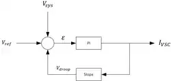 While in the region between its maximums, the STATCOM is said to be in a voltage regulation mode, where it either supplies or consumes reactive current under its maximum capability, with the goal of regulating the system voltage. A key parameter of the voltage regulator mode is the regulator slope, which functions similar to a generator's droop speed control, and effectively sets an allowable voltage difference the STATCOM will tolerate, but based on its current output. The slope is often specified as a percentage, and represents the maximum voltage difference allowed, or vdroop. For example, a slope of 2% would allow a 2% vdroop from the STATCOM's set point when at maximum reactive output. To control this, the voltage regulator mode of the STATCOM uses a closed loop, PID regulator to feedback the reactive current of the STATCOM to control system voltage. A simplified PID regulator is shown below, where the system voltage is compared to a desired reference voltage, and combining the reactive current of the VSC and the regulator slope. Through this feedback, the dynamic capability of the STATCOM can be reserved.