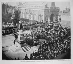 The statue was unveiled on the 28 March 1894 by Herbrand Russell, 11th Duke of Bedford. The Rifle Volunteers formed a square and the Bedford Volunteer Fire Brigade was in attendance with a steam fire engine. Gilbert refused to attend, as he had done with the unveiling of the Shaftesbury Memorial Fountain in 1893.[2]