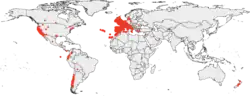 The spider is originally from the Canary Islands and Madeira.[12] It is an introduced species across Europe, parts of the United States and North Africa, and likely spreading.[13] It was found for the first time in 2011 in Cologne, Germany.[14] In England it has been reported mostly in southern counties,[15][16] but its range was reported to be expanding northwards in the 21st century.[17] In 2011, the spider was reported as an established invasive species in the USA, in Ventura County, California.[18] In January 2016, it was reported that Steatoda nobilis had been found in Chile, the first time that the species had been recorded in the southern hemisphere.[19][20] Research published in December 2018 showed that it was also established in Colombia and Ecuador.[21] The spider has been in New Zealand since at least 2023.[22] It is considered to be one of the world's most invasive species of spider.[9] Seaside cities and villages with a temperate climate are especially favourable habitats for S. nobilis.[13]