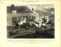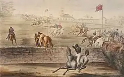 The steeplechase originated in Ireland in the 18th century as an analogue to cross-country thoroughbred horse races which went from church steeple to church steeple, hence "steeplechase". The first steeplechase is said to have been the result of a wager in 1752 between Cornelius O'Callaghan and Edmund Blake, racing four miles (6.4 km) cross-country from St John's Church in Buttevant to St Mary's Church (Church of Ireland) in Doneraile, in County Cork, Ireland.[1] An account of the race was believed to have been in the library of the O'Briens of Dromoland Castle. Most of the earlier steeplechases were contested cross-country rather than on a track, and resembled English cross country as it exists today. The first recorded steeplechase over a prepared track with fences was run at Bedford in 1810, although a race had been run at Newmarket in 1794 over a mile (1600 m) with five-foot (1.5 m) bars every quarter mile (400 m).[2] and the first recorded steeplechase of any kind in England took place in Leicestershire in 1792, when three horses raced the eight miles from Barkby Holt to Billesdon Coplow and back.[3]
