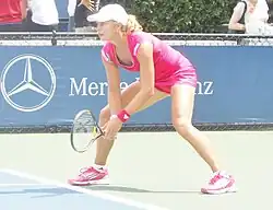 Vögele began the US Open Series at the Stanford Classic where she defeated wildcard Ajla Tomljanović in the first round 6–4, 6–0.[41] In the second round, she lost to third seed and eventual champion, Dominika Cibulková.[42] Playing at the Washington Open, Vögele lost in the first round to sixth seed Mona Barthel.[43] Seeded fifth for qualifying at Cincinnati, she lost in the first round to Sofia Arvidsson. Seeded fifth for qualifying at New Haven, she qualified by defeating American wildcard Katerina Stewart, Alexandra Cadanţu, and Yaroslava Shvedova but then lost to fellow qualifier Alison Riske. At the US Open, Vögele lost in the first round to world No. 105, Anna Karolína Schmiedlová.