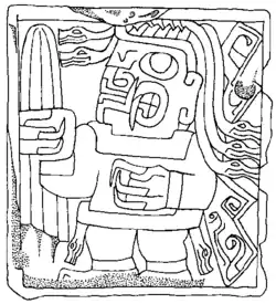 • Headstone VI-NW7 ("trumpeter", 'pututero'), next to the personage on headstone VI-NW6, represents an anthropomorphic being in profile, walking towards the western stairway (or southwest stairway) holding a conch shell or pututo with their right arm and blowing it.[26]