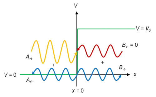 To study the quantum case, consider the following situation: a particle incident on the barrier from the left side A→. It may be reflected (A←) or transmitted (B→). Here and in the following assume E > V0.