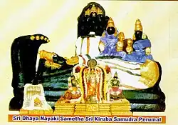 A special feature of this temple is that this is one of the only two Divya Desams where the image of Vishnu is depicted in Sayana Kolam (sleeping posture) facing the Southern direction, the other being Srirangam Ranganathaswamy temple.[2]