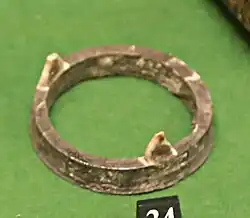 A stilt has been found at a Roman kiln site near Holt, Wrexham County Borough dating to around the first or second century AD.[9] It was designed to be used within a saggar and has clay pads supporting it within the saggar.[9]