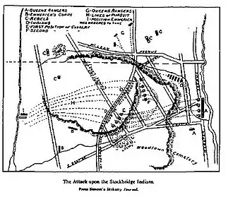 In August 1778, the Stockbridge Militia was stationed at an outpost in what is now the Bronx, just north of Manhattan.[3] They were attached to a newly formed Light Infantry Corps commanded by Continental Army general Mordecai Gist. The Queen's Rangers, a Loyalist military unit under the command of Lieutenant Colonel John Graves Simcoe, led an attack on the Stockbridge Militia in what became known as the Battle of Kingsbridge[4] Cortlandt Ridge,[5] Van Cortlandt's Woods,[6] or The Stockbridge Massacre.[3] The Queen's Rangers were developed from Rogers' Rangers, a provincial unit in which many Stockbridge Indians had served during the French and Indian War.