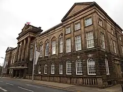 The council meets and has its headquarters at the Civic Centre on Glebe Street, a complex of buildings which incorporates both the Stoke-upon-Trent Town Hall of 1834 (which contains the council chamber) and a large extension to the north-east built in 1992.[52][53]