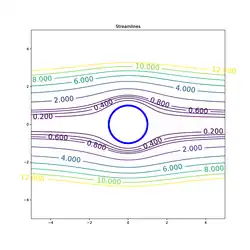 Streamlines of creeping flow past a sphere in a fluid. Isocontours of the ψ function (values in contour labels).