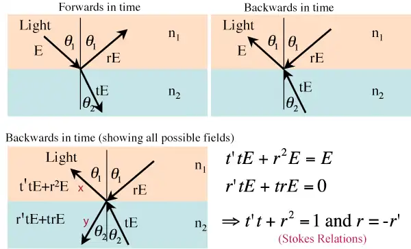 A reflection of the incoming field (E) is transmitted at the dielectric boundary to give rE and tE (where r and t are the amplitude reflection and transmission coefficients, respectively). Since there is no absorption this system is reversible, as shown in the second picture (where the direction of the beams has been reversed). If this reversed process were actually taking place, there will be parts of the incoming fields (rE and tE) that are themselves transmitted and reflected at the boundary. In the third picture, this is shown by the coefficients r' and t' (for reflection and transmission of the reversed fields). Everything must interfere so that the second and third pictures agree; beam x has amplitude E and beam y has amplitude 0, providing Stokes relations.